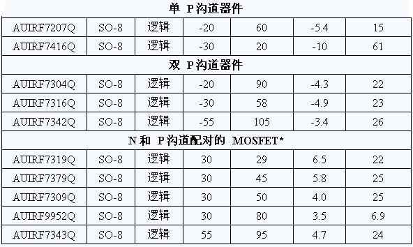 新系列 MOSFET 器件采用 IR 经过验证的平面技术和 SO-8 封装,内含单双 N/P 沟道器件,除了集成在单一封装上的N/P沟道器件,还提供坚固、紧凑的系统解决方案,以驱动汽车应用中的多个输出或半桥电路。