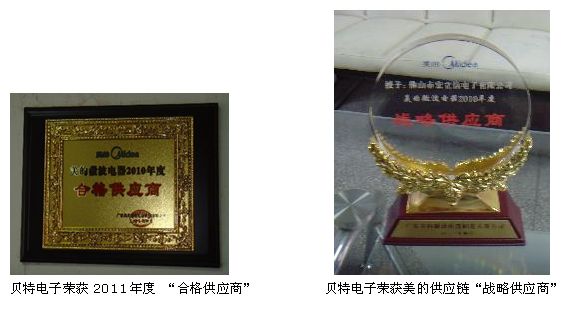 与美的合作近8年来,贝特电子有限公司凭借过硬的产品质量,极强的研发能力,优质的售前售后服务,成功获得“合格供应商”及“战略供应商”两项大奖,并得到奖金3万元。
