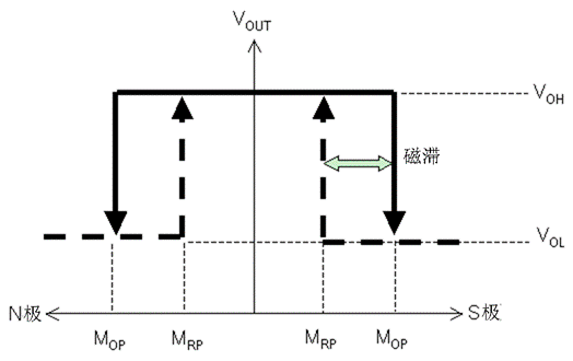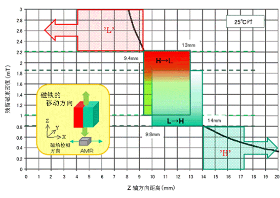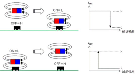 AS系列能够通过磁铁和传感器之间的距离改变来检测出磁通密度的变化,控制传感器输出信号的开关(高(H)<=>低(L)),如图5所示。当磁铁接近传感器,使磁场的强度变大,则传感器的输出就会由“高”变“低”,反之则由“低”变“高”。