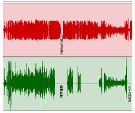 在同步过程中,S在170m左右时,在无屏蔽隔阻的情况下出现跑频现象,再前进约5m就完全没有信号,参见图2(下):L有212m左右时进入北门洞,由于屏蔽很严重而出现跑频现象,参见图2(上)。图2的时间座标相同,波形中中断部分为因跑频而赞成的无接收信号,可以看出。L的接收情况远好于S。