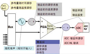 相对而言,精度的概念是指测量值与“真实”值之间的最大偏差的绝对值。如图1所示,信号在整个数据采集系统中会受到参考量随时间、温度的飘移误差、随机误差、非线性误差、增益误差等影响,这些影响综合之后对测量结果所产生的影响就是我们所说的测量精度。