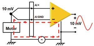 接地环路会严重影响测试结果,例如,在图4所示的电路中,为了能够长时间监测一个电机的温度,在电机上连上一个热电偶传感器,由于电机箱是接地的,因此热电偶也接地,而数据采集设备地与电机箱地之间存在电势差,因此产生了电流。你可以注意到,加在测试信号的噪声可能是交流的,或者一个简单的直流偏移值,但最终无可避免地影响了测试精度。