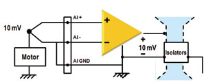 为了避免接地环路,需要选择合适的接地模式,特别是在测量一个接地传感器时,应该尽量避免使用单端输入方式(RSE),这种方式会直接在数据采集设备与传感器地间产生电流。如果使用的是差分方式(DIFF),由于电路为开路,因此电流被制止,从而较好地抑制了接地环路。当然,相比于差分,通过隔离技术(见图5),可以在不让两个地相连,分隔数据采集设备地的同时,保持数据值的传输,从而从根本上解决了环路问题.