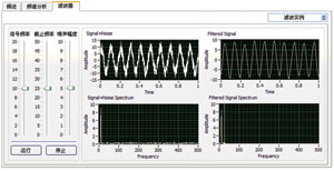 图6就是使用NILabVIEW图形化开发平台实现软件滤波的实例,当信号具有一定噪声时,通过LabVIEW自带的滤波器VI,对信号进行低通滤波,滤除掉25Hz以上的噪声,从而得到原始信号(FiteredSignal)。