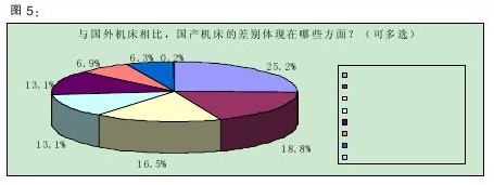 中外机床产品的差距依然巨大据中国机床工具工业协会统计,2010年我国机床工具产品进口总额为157.2亿美元,同比增长62.0%,国内机床进口额与历史最高的2008年同期相比还增长了27.8%,创历史新高。进口的增长迅猛表明国内机床与国外机床的差距依然很大。本次调查报告显示,中外机床的差距主要体现在三个方面:加工精度(25.2%)、可靠性(18.8%)、机床内部电、气、控等配置(16.5%)。紧跟其后的是加工速度和外形方面的色彩、精美程度等,均占13.1%(详见图5)。由此可见,技术尤其是对精准度和可靠度是国外机床领先国内机床的优势来源。另外,对外形的关注也是近年来客户在使用方面出现的一种新口味。