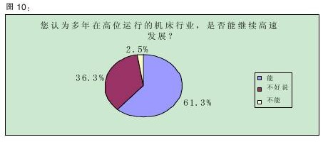 据年初中国机床工具工业协会的预测,2011年机床行业总体增幅将大于10%。从本次调查的情况来看,业界对行业的增长预期要比协会方面直接和乐观许多,有61.3%的受访者认为,多年来高位运行的机床行业“能继续高速发展”,而持“不能”态度的人仅占2.5%(详见图10)。