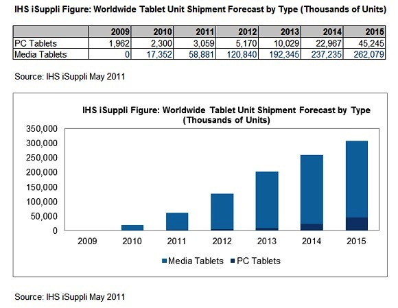 IHS iSuppli估计,在2010年到2015年间,多媒体平板计算机的总出货量将达到8.887亿台,但同期间PC型平板计算机的出货量仅有8,880万台;在2015年,PC型平板计算机总出货量预测为4,520万台,该数字在2010年为230万台,期间平均年复合成长率(CAGR)为81.5%。但在多媒体平板计算机部分,出货量在2010年为1,740万台,2015年将达到2.621亿台,期间CAGR为17.4%。