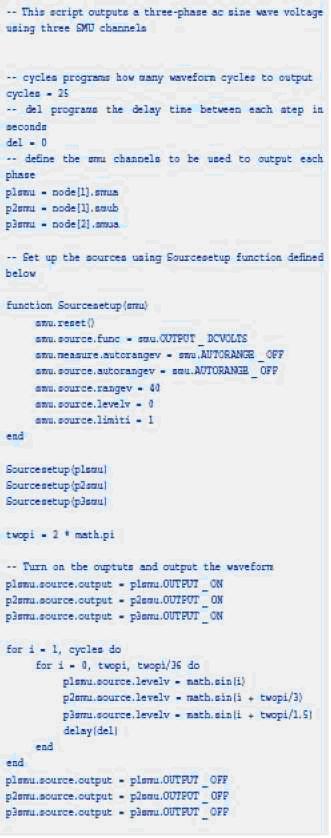 这部分包含许多脚本例子说明吉时利支持脚本的仪器的一些特点。图1示出了两台吉时利系统源表如何使用单脚本控制产生3相交流波形。在这个例子中,使用吉时利的TSP-Link技术连接这两台仪器,因而很容易用脚本控制这两台仪器。