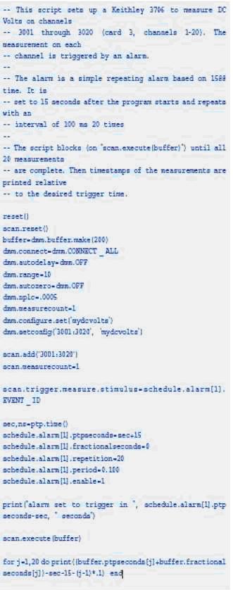 图2说明了基于LXI Class B技术的定时器如何控制脚本工作。在此脚本中,吉时利3706型LXI Class B仪器使用基于IEEE 1588的计时器排列一系列测量的顺序。LXI Class B的定时特点特别适合避免或最小化由延迟或通信时延导致的系统时延。