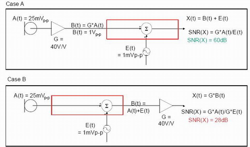 图1给出了采用这种方法的一个例子。麦克风产生的25mVp-p信号A(t)必须穿越PCB,并被放大到1Vp-p进行进一步处理。红色框表示穿越PCB的走线,它会遭受耦合噪声的影响,用信号E(t)表示。在方案A中,信号在靠近麦克风、穿越PCB板和耦合到噪声之前得到放大。结果系统的SNR是60dB。而在方案B中,信号在走线穿越PCB和耦合进噪声之后才得到放大,结果系统的SNR只有28dB。因此优秀的系统设计可以实现显著的性能提高。