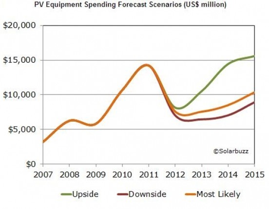 二三级光伏制造商的设备支预计价格在2012年出现60%的年度降幅。据Solarbuzz表示,至2015年,一级制造商将占到所有光伏设备支出的70%以上。