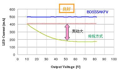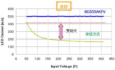 传统方式中,输入电压变动和输出电压变动大,须根据应用条件重新设计电源???。如果输入电压变动大,则交流电压频率(全波整流后为100Hz~120Hz)中带纹波的输入电压会使得LED的亮度发生闪烁。为了稳定输入电压,必须在设计电源??槭辈扇〈胧?。如果输出电压变动大,就必须针对每一个光源的输出电压(LED的灯数)变更外接元器件的常数,设计出许多种电源??槔?,从而增加了设计工作量(图2)。