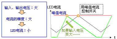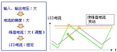 此方法利用输入、输出电压的变化来改变线圈电流的梯度,其结果是LED电流值也变化。(图3-1)