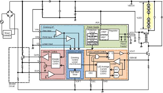 为使LED稳定地点亮、调光,需要使用LED驱动器IC,而且要求这种驱动器IC能与功率和调光方式等五花八门的电源相适应。