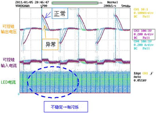 可控硅调光器在可控硅处于导通状态时必须使保持电流持续流通;一旦保持电流下降,可控硅便关断了。由于LED照明灯与原有照明灯相比,功耗极低,所以使可控硅的保持电流下降,调光器就往往会因此而不定期关断从而发生闪变(闪烁)现象。(图5)