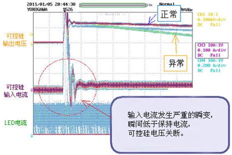 但是,即使装载了确保保持电流恒定的泄放电路,还是有不能防止可控硅调光器引发误动作的情况出现。其原因是因为可控硅接通时使输入电容充电的冲击电流会造成大的瞬变,保持电流瞬间下降从而造成可控硅关断(图6)。