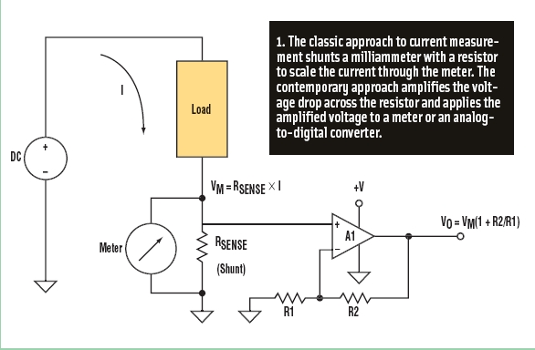 图1:通过电路进行电流测量的最常用方法是测量一个低值电阻两端的电压降。