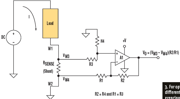 为避免引入这样的误差,需要进一步增加两个措施:采用开尔文连接方式与分流电阻相连并加入一个差分输入放大器??牧邮且恢执辛教跫だ吆土教醮幸叩?线连接(图2)。其中两条线(W1和W2)是激励引线,它们将分流电阻连接到该电路的大电流端。另外两条线(W3和W4)为传感引线,它们将分流电阻两端的电压连接到放大器。这个方式将携带负载电流的导线与测量电路分离开来,并把W1和W2中的电压降从分流电阻两端的电压测量中清除。为了进一步有效利用开尔文连接的优点,还需加入一个差分放大器(如图3)。