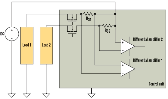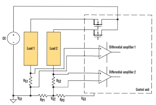 与图1中一样,流过每个负载的电流均为10A,分流电阻RS1和RS2均为0.025 Ω。流过控制单元的电流为1A。当负载2运行时,在点VG2点的电压比VG1点的电压高2V (0.2 Ωx10 A = 2 V),VG3比VG2高0.2V。因而,相对于在该控制单元的共同连接点,差动放大器1的输入电压为-2.2V,高于大多数放大器的负共模电压极限。除非该差分放大器所使用的放大器针对负共模电压而进行了特殊的设计,否则,该放大器在这个电路中将无法正常工作。对于本例而言,低端传感还有一个缺点是需要用导线将分流电阻和差动放大器输入连接起来。