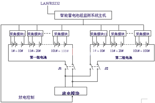 电池巡检仪主要是能够发现蓄电池短路、断路和电池异常等状况,但对蓄电池容量下降很难发现,即时能够监测容量,与真实容量有很大的差距。随着人们对阀控式密封铅酸电池研究的深入,蓄电池内阻已经成为衡量电池好坏的一个重要指标,内阻检测成为电池维护一个重要手段。内阻跟蓄电池容量之间没有严格的数学关系,无法根据单个电池的内阻值去预测蓄电池的寿命和容量,蓄电池内阻突然增大,蓄电池的容量将发生变化,通过对内阻测试数据不断累积和定量分析,可以推断出电池容量变化趋势和寿命情况。人工进行内阻测试耗时,测试数据少,一般要求一年一次,测试数据不能及时存储和多年保留,分析功能较差。因此在电池巡检的基础上,增加了内阻在线检测,并采用现代的通讯和计算机等技术,建立了蓄电池在线智能监控系统。系统主要由数据采集???、放电模块、监控单元三部分组成,具有实时监测电池的运行参数(电压、电流、温度)、定时自动测试电池内阻、静态放电测量电池容量、综合测量判断电池性能及变化趋势以及显示报警功能,系统还可实现网络化、智能管理。如图2所示。