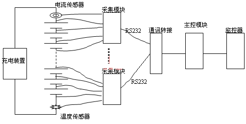 在电力系统变电站目前使用较多的蓄电池在线监测装置是电池巡检仪,电池巡检仪又分为两种,一种是测量蓄电池单体电压的巡检仪,结构是由一个主控??楹褪霾杉?樽槌?,主模块接收监控器的命令,发送电池数据到直流设备的监控器;采集模块中每个??椴杉?0~20节电池的电压、电流和温度;通过直流充电设备的监控器可显示各单节电池电压,判断故障电池的编号且给出报警。这类电池巡监仪一般由直流设备生产厂家提供,在订货直流设备时它是选配装置,由于功能单一、不能测试容量、且测量精度差、容易误报,限制了它的广泛使用。测试示意图如图1: