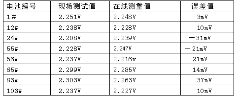 根据规程的要求,日常测量蓄电池端电压采用是高精度4位半的数字万用表,一般高精度万用表蓄电池直流电压档测量精度为0.7%以上,绝大多数蓄电池在线装置产品说明书上提到的测量精度达到了0.5%以上;显示测量数值有些蓄电池在线装置的测量端电压数值为小数点后2位,与规程要求有较大误差;有些装置测量值虽可以到小数点后3位,但与实际用表测量数值相差较大。从运行情况看,端电压在线监测的误差是随机,每个数值偏差都不一致,而且偏差值随着环境温度、浮充电压变化等而变化。表1为现场任意抽查几个蓄电池浮充电压,现场测试值与在线测量值的误差情况,现场测试采用FLUK111数值万用表直流档测量精度0.7%,在线测量为许继电源公司的WXJ-16型巡检仪,测试环境温度25℃。