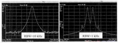 图2是不同分辨率带宽频谱的显示,可以看到分辨率带宽RBW=10 kHz时不能辨别出载波形状,分辨率带宽RBW=1 kHz时可以清楚地辨别出载波形状。
