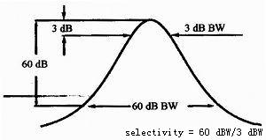 中频滤波器的频率选择性是中频滤波器的60 dB带宽与3 dB带宽之比,如图3所示。它反映了频谱仪分辨不等幅信号的能力,对于幅度相差60 dB的2个信号,其间隔至少是60 dB带宽的一半,才可以分辨出2个信号,否则小信号可能被淹没在大信号的裙边中。用数字化技术实现的窄带带通滤波器频率选择性可达到5:1,模拟滤波器频率选择性可达到15:1或11:1。图3为滤波器的频率选择性示意图。