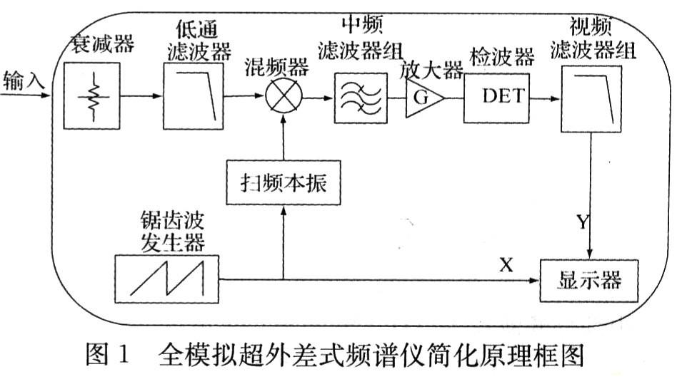 现代宽频频谱仪大都采用扫频超外差式接收方案,全模拟超外差式频谱分析仪简化原理框图如图1所示。