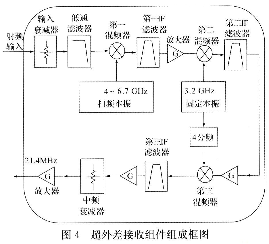 组件采用三级混频方式实现,第一中频4 021.4 MHz,第二中频821.4 MHz,第三中频21.4MHz,这样选择的目的是第三混频需要的800 MHz本振可以由第二混频需要的3.2 GHz本振4分频产生,从而减少了本振数量,降低了体积。