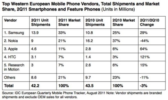 报告显示,今年第二季度西欧地区移动产品出货总量同比下降3%。IDC分析师弗朗西斯科·杰若尼莫(Francisco JerONimo)表示,欧洲严峻的经济形势以及诺基亚发货量的直线下降是两大主要原因。