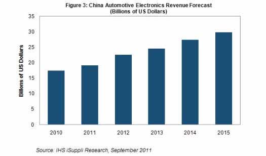 据IHS iSuppli公司的中国研究报告,2011年中国汽车电子市场销售额预计将达到192亿美元,比去年的175亿美元增长9.7%。