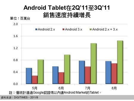 DIGITIMES Research分析师兼项目经理林俊吉根据Google每月公开的连上Android Market 装置规格分布比例信息后估算,通过Google认证的Android Tablet月销售量应已从2011年第二季的不及百万台,在8月份迈入近150万台的水平。