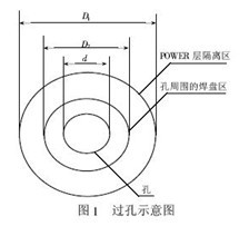 过孔是多层PCB 设计中的一个重要因素,一个过孔主要由三部分组成,一是孔;二是孔周围的焊盘区;三是POWER 层隔离区。过孔的工艺过程是在过孔的孔壁圆柱面上用化学沉积的方法镀上一层金属,用以连通中间各层需要连通的铜箔,而过孔的上下两面做成普通的焊盘形状,可直接与上下两面的线路相通,也可不连。过孔可以起到电气连接,固定或定位器件的作用。过孔示意图如图1 所示。