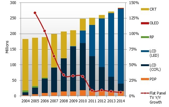 等离子电视出货增幅将于2011年第二季开始减缓,年降幅为6%,并将于2012年中期每季度下滑两位数的百分比。由于液晶电视价格下降幅度大于等离子电视,两者价格差缩小,液晶电视在许多尺寸的占比提高。例如:在2010年第二季,一台42寸1080p的等离子电视比一台42寸1080p 120HZ LED液晶电视价格便宜32%,但到2011年第二季价格差缩小到了9%。2011年等离子电视总出货量为1700万台,降幅为9%,随后每年降幅在5-6%左右。