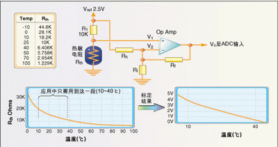 有时需要对热敏电阻的输入进行标定以便得到合适的温度分辨率,图3是一个将10~40℃温度范围扩展到ADC整个0~5V输入区间的电路。运算放大器输出公式如下:
