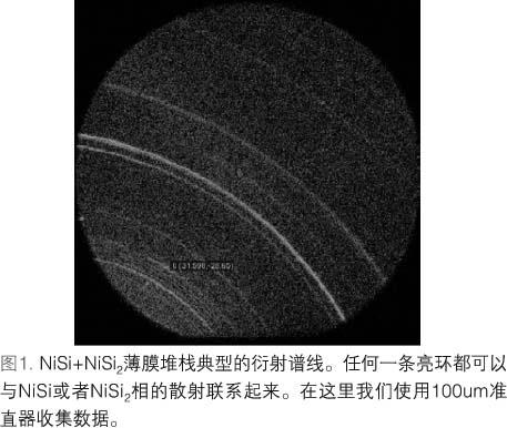 第一代应用于多晶材料的XRD量测设备由HyperNex Inc和IBM共同研发,并安装在IBM位于纽约East Fishkill的半导体研发生产工厂。该设备的硬件设计极具针对性,它包括固定的放射源和探测器,可以在xy水平方向移动,在方位角方向旋转的水平采样载物台。水平载物台需要与硅片的传送机械臂兼容,而xy传送载物台允许全硅片映射,它的重要性在随后的章节中会变得显而易见。X射线束使用可变的缝状源,从而使得光束采样可以覆盖从50um到1mm的范围??砉馐美瓷栉尥夹蔚墓杵?,窄光束用来获得有图形硅片上独立结构的衍射谱线。描述独立结构特性的需求决定了系统必须具备视频显微镜和图形识别软件。为了满足高速产出的需要,二维场探测仪被用来收集衍射谱线。图1说明了一幅探测仪收集到的衍射谱线。将场探测仪收集的图形组合起来便是传统的衍射图形(图2),它可以用作相鉴定和多相薄膜中相数的量化,图形中根据环强度的变化可以获得该材料晶体织构的信息,环的宽度决定了相关晶粒的大小。