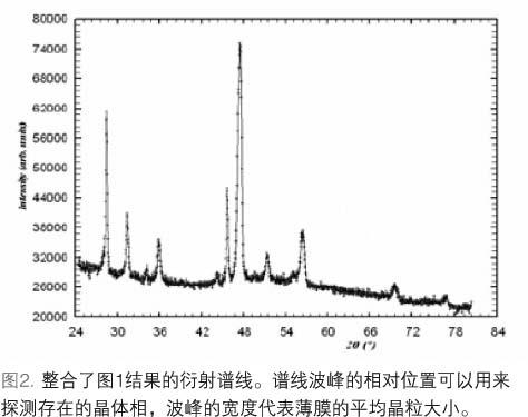 相分析要求事先了解感兴趣的相。一种自动化的峰拟合算法用来获得曲线中每一个峰的位置和强度值。将实验峰值的位置与感兴趣相的谱线作对比,来确定该相是否存在。另外,曲线中不能被匹配的峰意味着更多的相存在。例如在图2中,如果取样程式认为在测量的硅片上只存在镍单硅化物,尽管事实上相的鉴定需要手工完成,但多余的峰(来自于NiSi2)仍然会被软件标记。为了测量不同相的比例,一种针对多相系统的应用遵循了这样的原理,即一个独立相衍射峰的强度(一级近似)与薄膜中对应相的数量成比例。