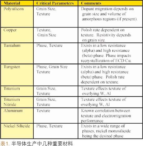 表1总结出半导体生产中可以通过X射线衍射量测的多晶材料。几种有代表性的应用技术在下面详细列出。