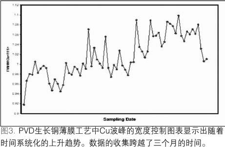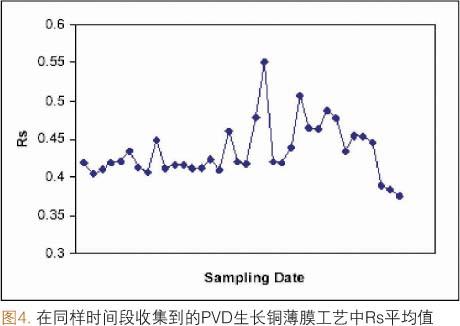 这种设备最初的一种应用是监测一系列物理气相淀积(PVD)的反应腔,这些反应腔在铜互连金属化制程中被用来淀积TaN/Ta/Cu衬垫层和籽晶层。这种监测作为标准的平面电阻,膜厚量测的补充而存在。薄膜堆栈中Ta和Cu成分的织构强度和谱线展宽数据都需要收集。TaN层具有无定形结构,因此无法监测。图3说明了一个从铜元素峰宽控制图表中输出的例子。数据的趋势稳步向上,表明PVD铜籽晶的平均晶粒大小随着时间在减小。图4说明了在相应的Rs图表中类似但并不十分显著的增加。随后的设备诊断发现受影响的反应腔一个阀门有空气泄漏的现象。泄漏影响到溅射工艺,进而影响铜籽晶层的淀积,这一过程极有可能是在淀积和淀积之后的自退火过程中,由于铜在Ta表面的迁移率下降造成。更换了阀门之后,Rs和铜元素峰宽的值都变小,我们从图3和图4控制图表中的最后三个数据点可以看出。