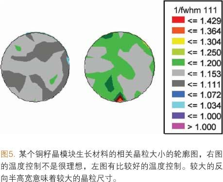 这里举一个问题诊断的例子,它是因为不良的温度控制导致某铜籽晶??樯さ牟牧暇Я3叽绮?。通过对该??樯さ耐魅粘5钠桨宓缱韬湍ず窦嗖猓⒚挥蟹⑾秩魏我斐#呱系腦RD系统显示相关的晶粒尺寸有偏移(反向半高宽FWHM)。图5说明了某个铜籽晶模块生长材料的相关晶粒大小的轮廓图,右图的温度控制不是很理想,左图有比较好的温度控制。较大的反向半高宽意味着较大的晶粒尺寸。