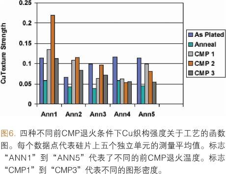 硅片在制程中的三个不同步骤进行测量:电镀之后,前CMP退火之后,金属化之后。图6说明了在M1测得的铜织构强度的结果。我们将最终结果作了平均,因为没有观察到铜微结构在硅片中央和边缘有任何不同。从数据中可以看出很多趋势,但应该强调的是,微结构的数据可以与其他线上量测的结果直接联系起来,特别是硅片的良率。所有的结果综合起来,可以选择出该技术节点比较优化的前CMP退火条件。