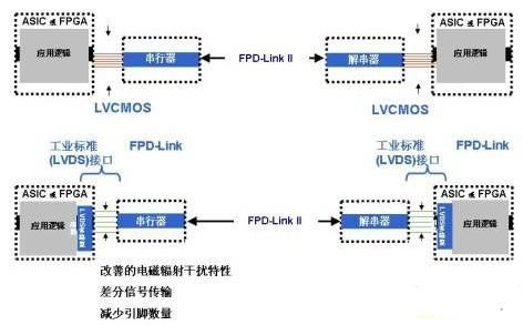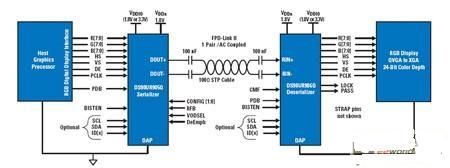 一旦接收器PLL锁定在发射器的频率下,即可由LOCK输出标志引脚显示这一状态,确保接收器输出的数据完整性。DS90UR907/8芯片组具有DS90UR905/6芯片组的一切特性,两耳区别在于输入输出不再是发送LVCMOS信号的并行总线,而是遵照开放的工业标准"FPD-Link"。很多现代化的图像控制器、显示定时控制器、ASIC和FPGA都支持这种"一级串行化"技术,它采用适合18bpp的3个数据通道,或者适合24bpp的4个数据通道,每一个都有一路并行时钟通道。电信号的发送遵循开放的ANSI/TIA/EIA-644A标准,该标准又称作"LVDS"(低压差分信号传输)。使用该接口技术代替常规LVCMOS的优势在于:采用差分信号可降低电磁干扰,并减少组件的引脚数量,如图3所示。