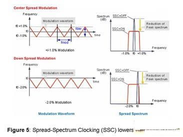 解串器通过一块集成可配置的扩频时钟(SSC)生成器得到增强。在接收器输出总线端,这会导致输出时钟频率和数据频谱随着时间推移而以几十KHz的低调制率产生轻微变化。如图5所示,频率变化可以发生在名义像素时钟中心频率附近("中心扩频调制"),或朝向更低的频率("向下扩频调制")。频谱扩展百分比可高达±2%。扩频时钟将峰值能量分散在更宽的频谱范围内,从而大大降低了电磁干扰噪声水平,而不是在同一时间点上、以恒定频率来转换所有输出,此时的辐射噪声集中在一个窄频段内,所有输出数据都与输出时钟同步,这使得数据和时钟得到有效扩展。特别是DS90UR906接收器输出具有低压(LV)CMOS接口选项,可以大大降低电磁辐射。