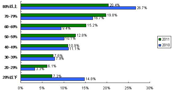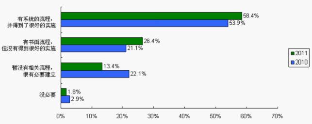 供求双方把伙伴关系建立在专业评估的基础上,通过系统流程可以有效减少供应商认证和引入过程中的不合理操作、暗箱操作、防范采购风险、提高采购效率。在供应商认证与引入过程中,没有建立和认为没必要建立系统流程的受访者比例由2010调查的25%(22.1%+2.9%)降至2011调查的15.2%(13.4%+1.8%),已经建立流程并且得到很好实施的比例也由2010调查的53.9%上升至2011调查的58.4%。