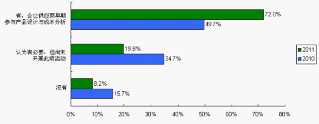 让供应商参与早期的产品设计是增进供求双方伙伴关系的途径之一,借助供应商的技术优势,挖掘元器件成本空间,从而提高产品竞争力、加快产品上市、降低成本。让供应商早期参与产品设计与成本分析由2010调查的49.7%大幅上升至2011调查的72%,而其中69.2%是主芯片供应商的参与,30.8%是被动元件供应商的参与。
