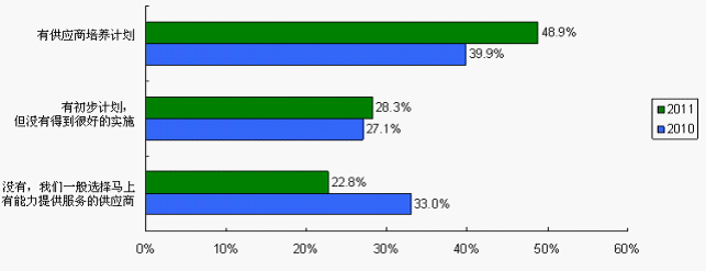 培养供应商有利于建立供求双方的伙伴关系,提高供应商忠诚度,增强采购风险抵御能力。有供应商培养计划的系统厂商由2010调查的39.9%上升至2011调查的48.9%,而没有计划的由2010调查的33%降至22.8%。