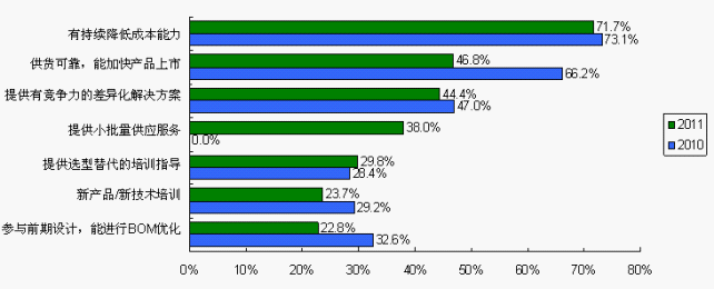 此外,工程师对成本降低持续关注,小批量供应服务成为工程师关注的亮点。随着市场的企稳,供货可靠不再变成重大事件。2011中国电子制造商采购行为调查发现,工程师对供货稳定可靠的期望由2010调查的66.2%大幅降至2011调查的46.8%。