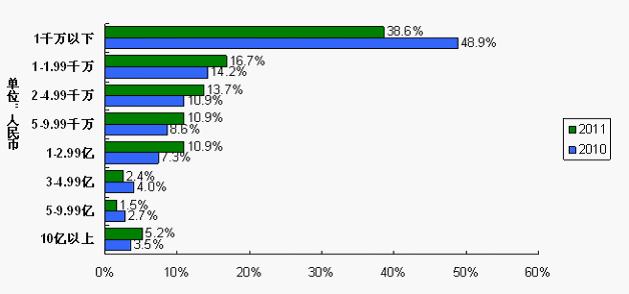 此外,IC和电子元器件的平均采购额由2010调查的1.02亿增加至2011调查的1.15亿,增加12.7%。采购总额在1亿人民币以上的系统厂商由2010调查的17.5%增加至2011调查的20.1%,大中型企业表现出成长。采购总额在1千万以下的系统厂商由2010调查的48.9%降至2011调查的38.6%,小微型企业由于经营困难或缺货冲击而倒下。