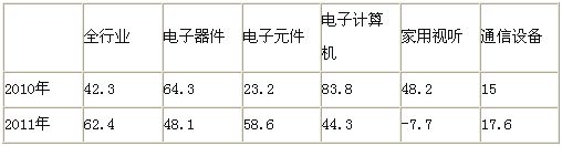 前三季度,电子元件、器件和信息机电行业分别完成投资1133、1615和1495亿元,同比增长58.6%、48.1%和120.2%,三个领域投资占全行业的65%,比重比去年提高3个百分点,对全行业投资增长的贡献率分别达到17%、21%和33%。整机行业投资增长放缓,其中视听行业完成投资89.5亿元,同比下降7.7%, 比重(1.4%)下降1个百分点;通信设备行业完成投资360亿元,同比增长17.6%,比重(5.5%)下降2.1个百分点;计算机行业在平板电脑等新产品带动下,在整机行业中增长相对较快,同比增长44.3%,但仍低于全行业18.1个百分点,其中9月份投资下降20.1%。